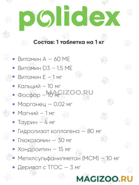 1 таблетки: витамин A — 60 МЕ, витамин D — 1,5 МЕ, витамин E — 1 мг, кальций — 10 мг, фосфор — 10 мг, магний — 1 мг, марганец — 1 мг, гидролизат коллагена — 80 мг, таурин — 4 мг, дериват с ТГОС — 3 мг, МСМ — 10 мг, глюкозамин — 30 мг, хондроитин — 15 мг. Не содержит искусственных отдушек и красителей.