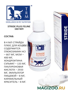 Страйд Плюс представляет собой комплексный препарат, в 4 мл Страйда Плюс для кошек содержится: Глюкозамин HCI – 667 мг, МСМ – 400 мг, хондроитина сульфат – 133 мг, гиалуроновая кислота – 2933 мг, эмульгатор пищевой – 8 мг, карамельный краситель – 8 мг.