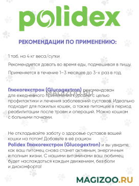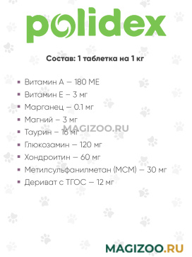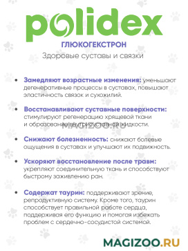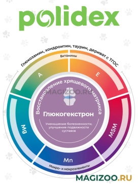 Информация о составе и ингредиентах, цветовом решении, технических и иных характеристиках, стране-изготовителе, внешнем виде и комплекте поставки товара носит справочный характер и основана на последних доступных к моменту публикации сведениях. Доставка данного товара осуществляется во все регионы РФ.За 10 лет кормовые добавки POLIDEX завоевали российский рынок и в настоящее время широко используются ветеринарными врачами, заводчиками и владельцами животных, а также прошли клинические испытания в ветеринарных клиниках Москвы и показали высокие положительные результаты.