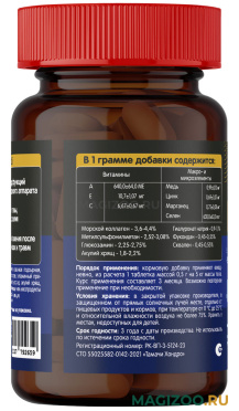 Ингредиентный состав: минеральный премикс (Cu (медь), Zn (цинк), Мn (марганец), Se (селен)) – 8,1 - 9,9 %, витаминный премикс (витамин А (ретинола ацетат), витамин Е (DL - альфа - токоферолацетат), витамин С (аскорбиновая кислота)) – 3,24-3,96%, сыворотка молочная сухая деминерализованная подсырная – 64,44 - 78,76 %, морской (рыбный) коллаген – 3,6 - 4,4 %, метилсульфонилметан (диметилсульфон) – 2,52 - 3,08 %, глюкозамин гидрохлорид - 2,25 - 2,75 %, акулий хрящ (порошок) - 1,8 - 2,2 %, гиалуронат натрия (низкомолекулярный) – 0,9 - 1,1 %, сублимированная печень говяжья (порошок сушеный из печени) или мясопродукты сушеные (порошок говядина) – 0,9 - 1,1 %, аэросил А - 0,9 - 1,1 %, фукоидан - 0,45 - 0,55 %, сквален - 0,45 - 0,55 %, стеарат кальция – 0,45 - 0,55 %.