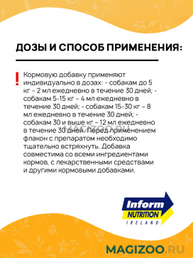 Кормовую добавку применяют индивидуально в дозах: - собакам до 5 кг – 2 мл ежедневно в течение 30 дней; - собакам 5-15 кг – 4 мл ежедневно в течение 30 дней; - собакам 15-30 кг – 8 мл ежедневно в течение 30 дней; - собакам 30 и выше кг – 12 мл ежедневно в течение 30 дней. Перед применением флакон с препаратом необходимо тщательно встряхнуть. Добавка совместима со всеми ингредиентами кормов, с лекарственными средствами и другими кормовыми добавками.