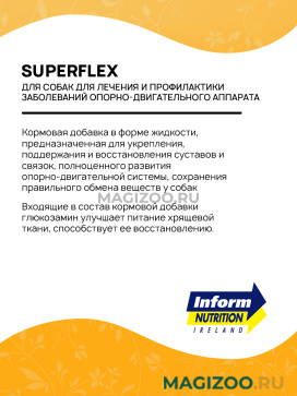 Cупер Флекс применяют как профилактическое средство растущим щенкам, молодым собакам с повышенной нагрузкой на суставы, пожилым животным для укрепления суставов и связок, полноценного развития опорно-двигательной системы, сохранения правильного обмена веществ, а также улучшения шерстного покрова у собак. Применение Cупер Флекс позволяет максимально дополнить питание собаки благодаря натуральным питательным компонентам, положительно влияющим на функцию тканей, суставов и хрящей.