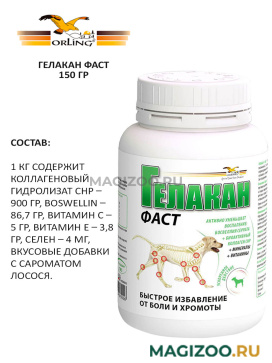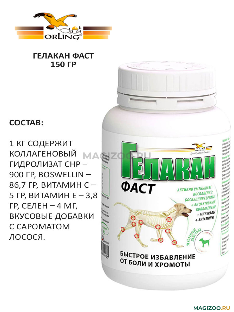 Моему ротвейлеру отлично помогает Гелакан ФАСТ, ему уже 11 лет, есть проблемы с суставами, был лишний вес. По утрам после сна и после активной прогулки начинал хромать, старался больше лежать. Знакомые по собачьей площадке рекомендовали попробовать гелакан фаст, и он помог моей собаке, хромота прошла, собака нормально ходит и бегает. Перед подачей смачивать!