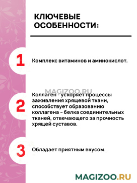 - Коллаген - ускоряет процессы заживления хрящевой ткани, способствует образованию коллагена – белка соединительных тканей, отвечающего за прочность хрящей суставов.