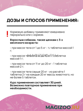 - при массе тела свыше 20 кг - из расчёта 1 таблетка 2 г на каждые 20 кг массы животного, но не более 5 таблеток.