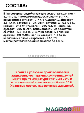 В 1 кг содержатся действующие вещества: коллаген – 9,0-11,0 %, глюкозамина гидрохлорид – 6,3-7,7 %, хондроитина сульфат – 3,7-4,6 %, дикальцийфосфат – 3,6-4,4 %, витамин Е – 0,6-0,8 %, витамин С – 0,6-0,8 %, ниацин – 0,13-0,17 %, селен – 0,08-0,10 %, марганца сульфат – 0,07-0,09 %, вспомогательные вещества: лактоза – 17,6-21,5 %, инактивированные пивные дрожжи – 9,0-11,0 %, магния стеарат – 1,3-1,7 %, коллоидный диоксид кремния – 1,3-1,7 %, микрокристаллическая целлюлоза до 100 %.
