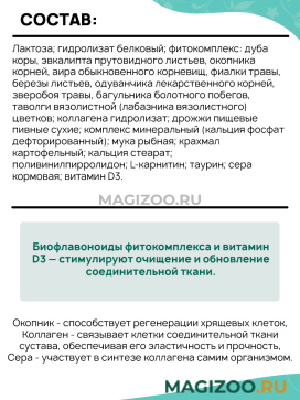 Лактоза; гидролизат белковый; фитокомплекс: дуба коры, эвкалипта прутовидного листьев, окопника корней, аира обыкновенного корневищ, фиалки травы, березы листьев, одуванчика лекарственного корней, зверобоя травы, багульника болотного побегов, таволги вязолистной (лабазника вязолистного) цветков; коллагена гидролизат; дрожжи пищевые пивные сухие; комплекс минеральный (кальция фосфат дефторированный); мука рыбная; крахмал картофельный; кальция стеарат; поливинилпирролидон; L-карнитин; таурин; сера кормовая; витамин D3.