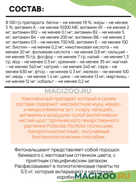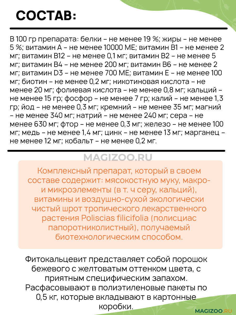 Ежедневное добавление Фитокальцевита помогает сбалансировать питание как при натуральном кормлении, так и при использовании готовых экструдированных кормов, полноценно восполняя потребности организма в витаминах и минералах.