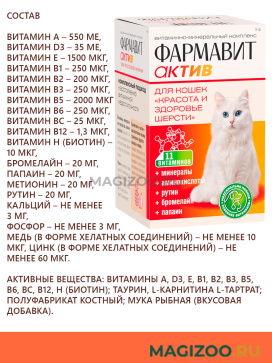 Фармавит Актив – витаминно-минеральный комплекс нового поколения для красоты и здоровья шерсти кошек с фруктовыми энзимами.