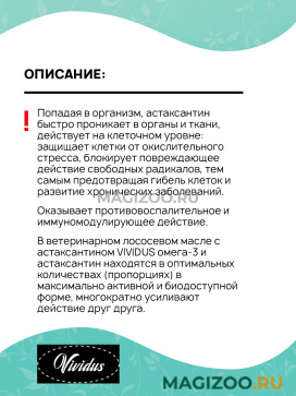 - В ветеринарном лососевом масле с астаксантином VIVIDUS омега-3 и астаксантин находятся в оптимальных количествах (пропорциях) в максимально активной и биодоступной форме, многократно усиливают действие друг друга.
