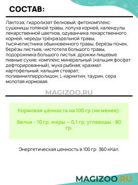 Лактоза; гидролизат белковый; фитокомплекс: сушеницы топяной травы, лопуха корней, календулы лекарственной цветков, одуванчика лекарственного корней, череды трёхраздельной травы, тысячелистника обыкновенного травы, берёзы почек, берёзы листьев, чистотела большого травы, подорожника большого листья; дрожжи пищевые пивные сухие; комплекс минеральный (кальция фосфат дефторированный); мука рыбная; крахмал картофельный; кальция стеарат; поливинилпирролидон; L-карнитин; таурин, сера молотая кормовая.