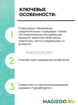Стимулирует обновление соединительных и хрящевых тканей. Систематическое употребление приносит заметное облегчение животному, часто страдающему от аллергии.