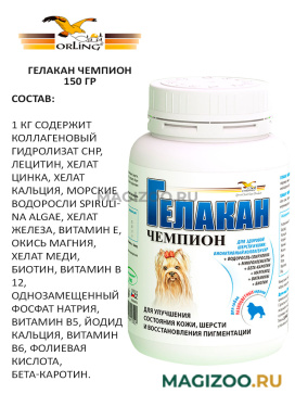 Гелакан Чемпион незаменим для выставочных собак или собак, испытывающих проблемы при сезонной линьке, является средством ежедневного ухода за состоянием волосяного (как, например, у йорков) покрова, существенно улучшает состояние кожи «лысых» пород собак. Оказывает ранозаживляющее действие при незаживающих сукровичных мозолях на локтевых суставах собак, а также при некоторых формах неинфекционного дерматита.