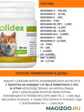1 таблетка на каждые 5 кг веса (в сутки). Принимать или замешивать в пищу, применяется курсами 2-3 месяца (весной и осенью), а также постоянно в течение года с перерывами на 1-2 месяца.
