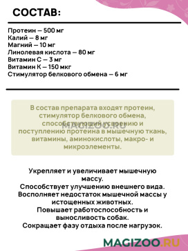 Стимулирует рост мышечной массы собаки, регулирует жировой и белковый обмен организма животного.
