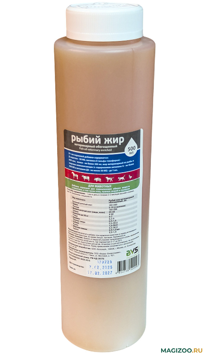 Витаминизированный рыбий жир, способствует повышению питательной ценности кормов, нормализации обмена веществ и увеличению продуктивности животных и птицы, улучшает рост и развитие молодняка, улучшает функции иммунной системы, уменьшает риск развития заболеваний суставов, участвует в регуляции обмена кальция в организме и формировании костной ткани.