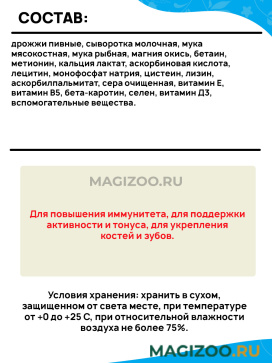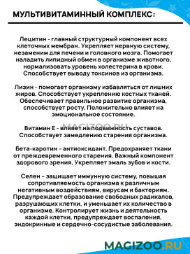 В своем составе комплекс содержит весь перечень необходимых витаминов, микроэлементов, аминокислот и минеральных веществ, необходимых для правильного и полноценного развития и полноценной жизни и здоровья Вашего питомца.