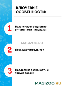 Мультивитаминный комплекс предназначен для регулярного употребления в рационе щенков, взрослых и стареющих собак, а также беременных и кормящих самок. Постоянное употребление мультивитаминного комплекса оказывает благоприятное воздействие на весь организм Вашего питомца. Повышает иммунитет. Способствуют укреплению костей и зубов. Обеспечивает правильное развитие организма (улучшению роста, оздоровление и восстановлению красивого внешнего вида и качества структуры шерсти).
