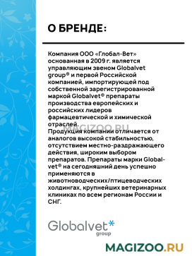 Информация о составе и ингредиентах, цветовом решении, технических и иных характеристиках, стране-изготовителе, внешнем виде и комплекте поставки товара носит справочный характер и основана на последних доступных к моменту публикации сведениях. Доставка данного товара осуществляется во все регионы РФ.Продукция компании отличается от аналогов высокой стабильностью, отсутствием местно-раздражающего действия, широким выбором препаратов. Препараты марки Globalvet® на сегодняшний день успешно применяются в животноводческих/птицеводческих холдингах, крупнейших ветеринарных клиниках по всем регионам России и СНГ.