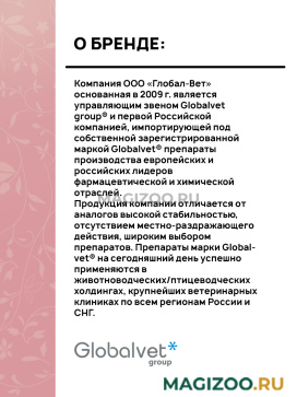 Информация о составе и ингредиентах, цветовом решении, технических и иных характеристиках, стране-изготовителе, внешнем виде и комплекте поставки товара носит справочный характер и основана на последних доступных к моменту публикации сведениях. Доставка данного товара осуществляется во все регионы РФ.Продукция компании отличается от аналогов высокой стабильностью, отсутствием местно-раздражающего действия, широким выбором препаратов. Препараты марки Globalvet® на сегодняшний день успешно применяются в животноводческих/птицеводческих холдингах, крупнейших ветеринарных клиниках по всем регионам России и СНГ.