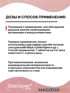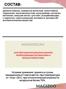 Показания к применению: для обогащения рациона щенков необходимыми витаминами и микроэлементами.