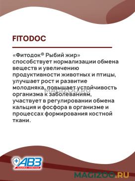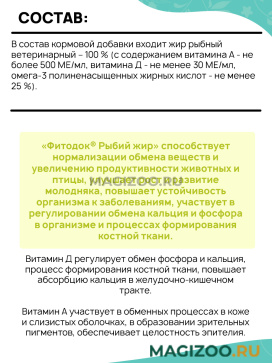 «Фитодок® Рыбий жир» способствует нормализации обмена веществ и увеличению продуктивности животных и птицы, улучшает рост и развитие молодняка, повышает устойчивость организма к заболеваниям, участвует в регулировании обмена кальция и фосфора в организме и процессах формирования костной ткани.