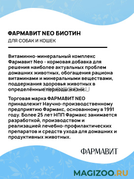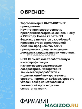 Торговая марка ФАРМАВИТ NEO принадлежит Научно-производственному предприятию Фармакс, основанному в 1991 году. Более 25 лет НПП Фармакс занимается разработкой, производством и реализацией лечебно-профилактических препаратов и средств ухода для домашних и продуктивных животных.