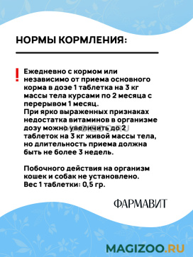 Ежедневно с кормом или независимо от приема основного корма в дозе 1 таблетка на 3 кг массы тела курсами по 2 месяца с перерывом 1 месяц. При ярко выраженных признаках недостатка витаминов в организме дозу можно увеличить до 2 таблеток на 3 кг живой массы тела, но длительность приема должна быть не более 3 недель. Побочного действия на организм кошек и собак не установлено.Вес 1 таблетки: 0,5 гр.