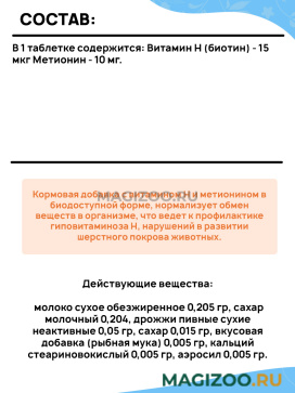 Кормовая добавка с витамином Н и метионином в биодоступной форме, нормализует обмен веществ в организме, что ведет к профилактике гиповитаминоза Н, нарушений в развитии шерстного покрова животных. Витамин Н оказывает регулирующее влияние на нервную систему, состояние кожного покрова. Способствует гладкости кожи, предотвращает её воспаление. Благодаря наличию в нем серы обеспечивает здоровье, красоту, яркий окрас и пышность шерсти. Препятствует выпадению шерсти. Метионин – источник серы, которая нужна для построения волоса, предупреждает шелушение и обесцвечивание шерстного покрова. Метионин – строительный материал для всех протеинов, снижает мускульную вялость, уничтожает жировые субстанции. Активатор гормонов и витаминов.