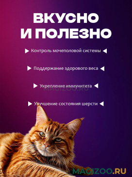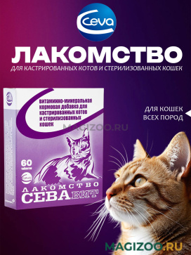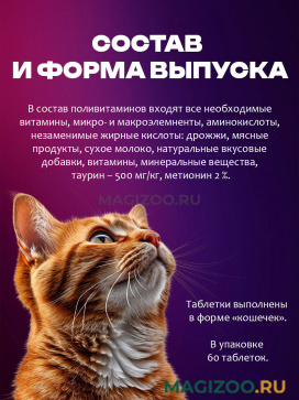 Витаминно-минеральная кормовая добавка для кастрированных котов и стерилизованных кошек предназначена для поощрения, а также в качестве дополнительного питания и источника биологически активных веществ: витаминов, аминокислот, макро- и микроэлементов.