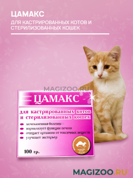 Кормовая добавка ЦАМАКС для кастрированных котов и стерилизованных кошек способствует восстановлению шерсти, утраченной в результате нарушения минерального обмена и длительных болезней кожи. Является сильным профилактическим средством против мочекаменных болезней, восстанавливает функции печени и почек и снимает аллергические реакции.