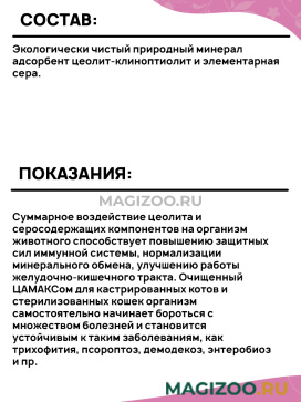 Лечебные свойства ветеринарного препарата ЦАМАКС для кастрированных котов и стерилизованных кошек обусловлены тем, что цеолит является мощным сорбентом, ионообменником и катализатором. Цеолит буквально выкачивает из организма тяжелые металлы, ртуть, радионуклиды, нитраты и фенолы, очищая организм от шлаков. Попадая в желудочно-кишечный тракт, препарат способствует замедлению прохождения пищи, что способствует лучшему усвоению питательных веществ и витаминов.