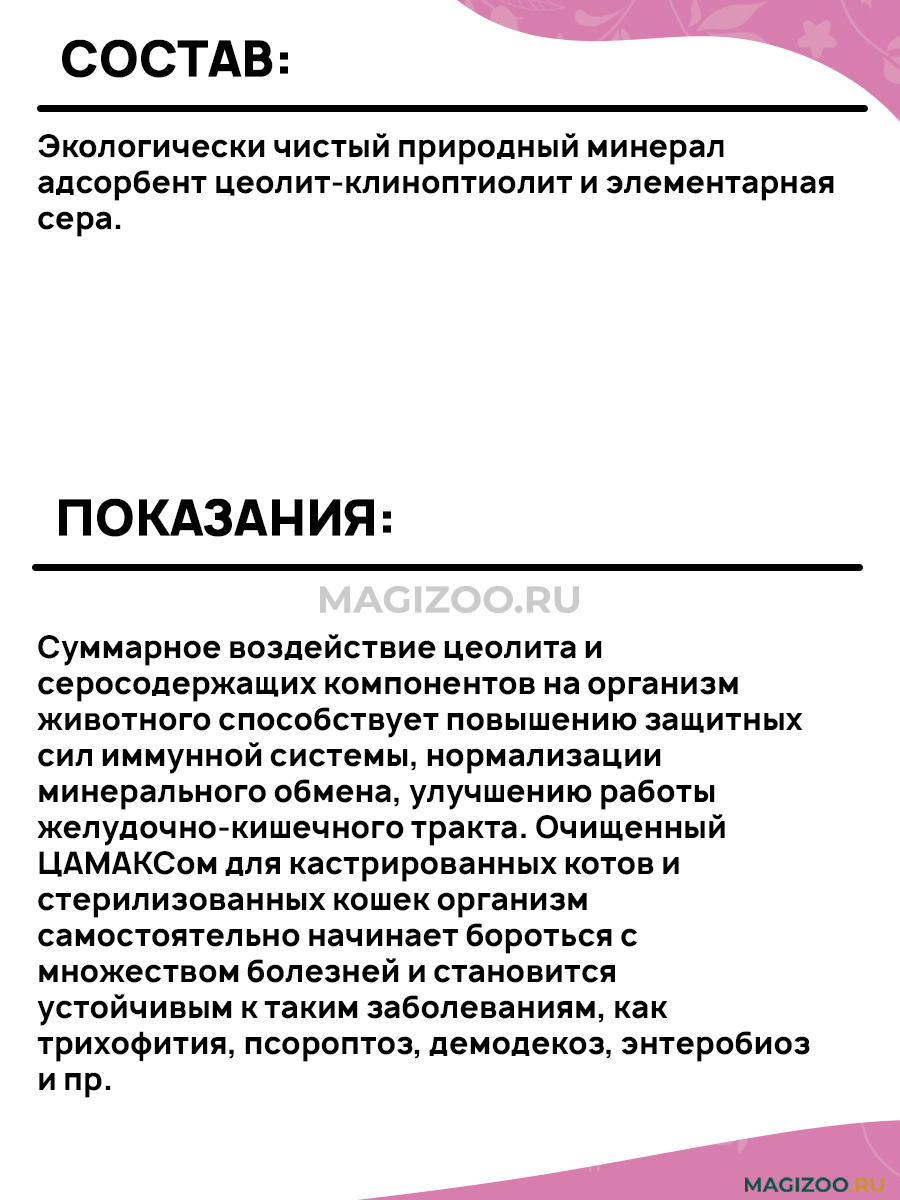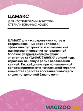 ЦАМАКС для кастрированных котов и стерилизованных кошек способен эффективно устранять этиологический фактор возникновения мочекаменной болезни, устраняя избыток таких элементов как цезий, барий, стронций и др. играющих основную роль в образовании камней. Так же Цамакс при мочекаменной болезни применяют в комплексной терапии в качестве средства восстанавливающего кислотно-щелочной баланс мочи.