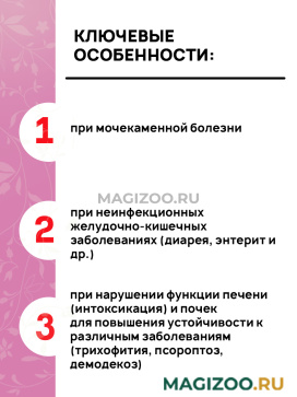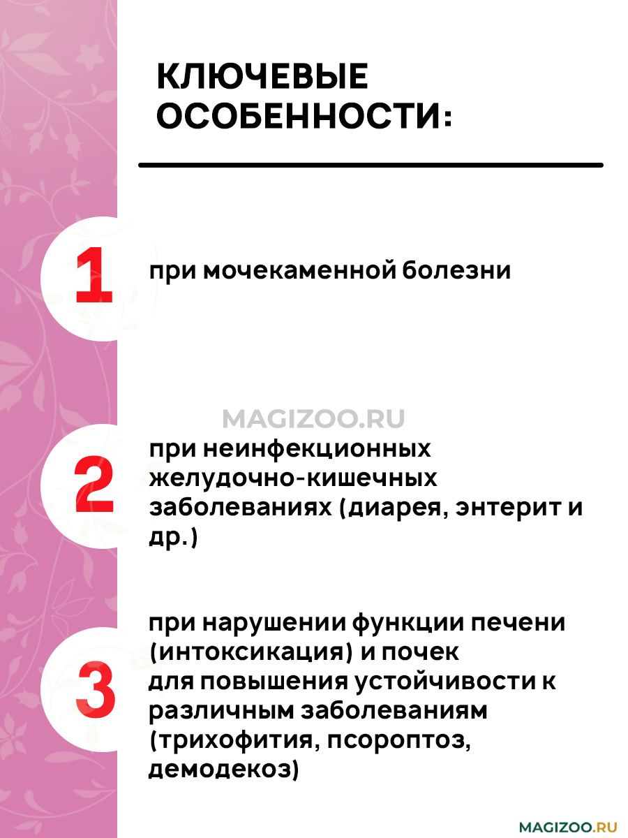 Кормовая добавка для кастрированных котов и стерилизованных кошек для профилактики развития мочекаменной болезни и восстановления функций печени.