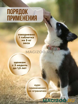 Порядок применения:С 3-хнедельного возраста ежедневно 1 таблетка на 5 кг массы тела. Курс применения не ограничен.