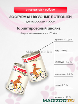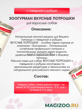 Мясной корм для собак ВКУСНЫЕ ПОТРОШКИ с говядиной и рубцом изготовлен по оригинальной рецептуре и технологиям из натурального российского мясного сырья.
