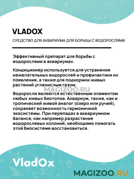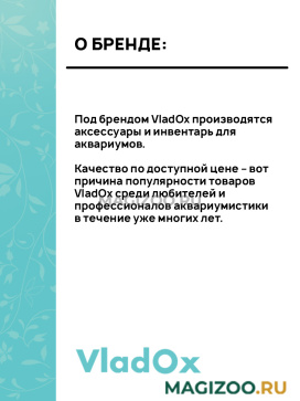Информация о составе и ингредиентах, цветовом решении, технических и иных характеристиках, стране-изготовителе, внешнем виде и комплекте поставки товара носит справочный характер и основана на последних доступных к моменту публикации сведениях. Доставка данного товара осуществляется во все регионы РФ.Качество по доступной цене – вот причина популярности товаров VladOx среди любителей и профессионалов аквариумистики в течение уже многих лет.