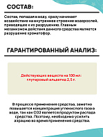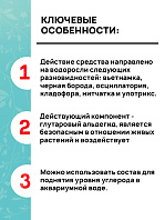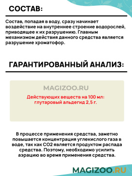Действующий компонент - глутаровый альдегид, является безопасным в отношении живых растений и воздействует исключительно на водоросли.