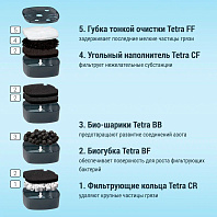 Фильтр обеспечивает химическую (активный уголь), механическую (губка)и отрегулированную биологическую (цеолит) фильтрацию. Насыщение воды кислородом происходит путем активного взбалтывания водной поверхности.