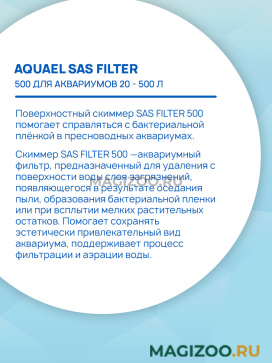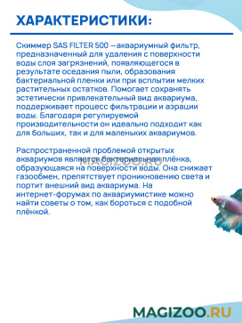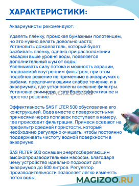 Скиммер SAS FILTER 500 —аквариумный фильтр, предназначенный для удаления с поверхности воды слоя загрязнений, появляющегося в результате оседания пыли, образования бактериальной пленки или при всплытии мелких растительных остатков. Помогает сохранять эстетически привлекательный вид аквариума, поддерживает процесс фильтрации и аэрации воды. Благодаря регулируемой производительности он идеально подходит как для больших, так и для маленьких аквариумов.