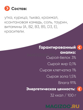 Состав: утка, курица, тыква, крахмал, ксантановая камедь, соль, таурин, витамины (А, В2, В3, В5, D3, Е), красители.