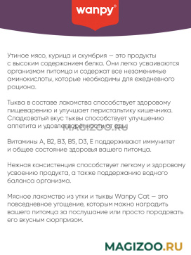 Мясное лакомство из утки и тыквы Wanpy Cat — это повседневное угощение, которым можно наградить вашего питомца за послушание или просто порадовать его вкусным сюрпризом.
