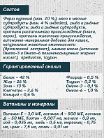 Состав: курица, краб, крахмал, каррагинан, соль, скумбрия, экстракт зеленого чая, витамины (A, B2, B3, B5, D3, E), полидекстроза, карбонат кальция.