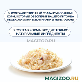В состав входят только натуральные ингредиенты: курица и морской гребешок, которые служат источником белка, необходимого для поддержания мышечной массы и здоровья кожи и шерсти. Скумбрия обогащает корм омега-3 жирными кислотами, которые положительно влияют на работу сердца и сосудов.