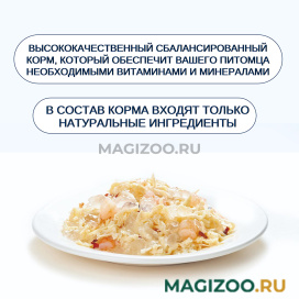 В состав корма входят только натуральные ингредиенты: курица и креветки, которые являются источником белка, необходимого для поддержания мышечной массы и здоровья кожи и шерсти.
