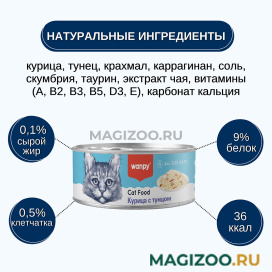 Wanpy Cat консервы для кошек с курицей и тунцом - это высококачественный сбалансированный корм, который обеспечит Вашего питомца необходимыми витаминами и минералами.