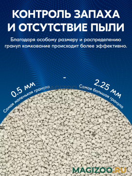 Структура и распределение гранул позволяют наполнителю хорошо комкаться и не допускать попаданию жидкости на дно лотка.