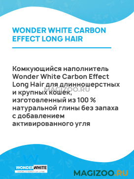 Комкующийся наполнитель Wonder White Carbon Effect Long Hair для длинношерстных и крупных кошек, изготовленный из 100 % натуральной глины без запаха с добавлением активированного угля.