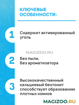 В составе белого бентонита черный природный уголь – природный абсорбент, придает наполнителю 2-ой контроль борьбы с неприятными запахами и идеальный прочный комок.