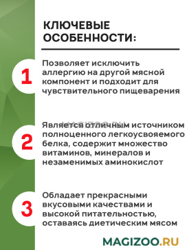 - позволяет исключить аллергию на другой мясной компонент и подходит для чувствительного пищеварения
